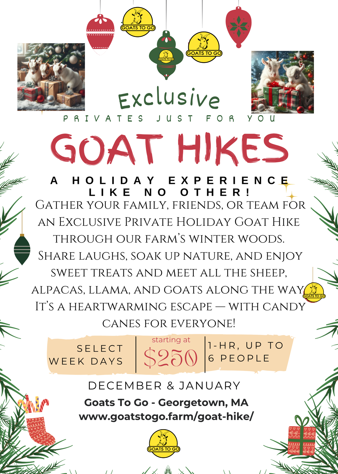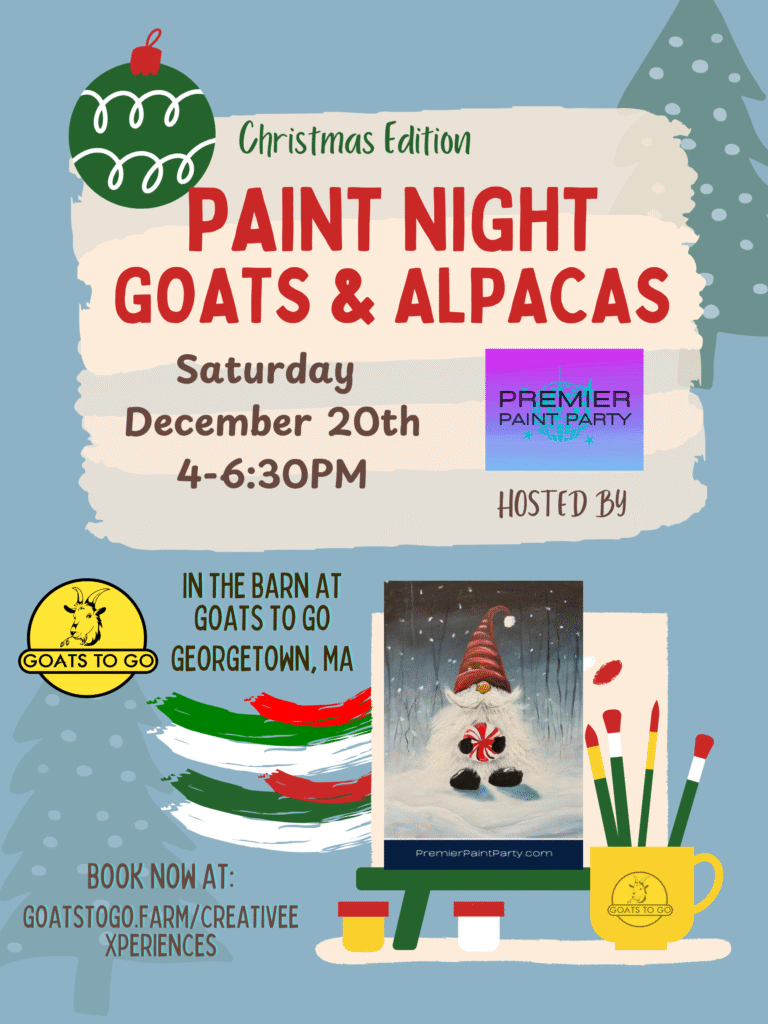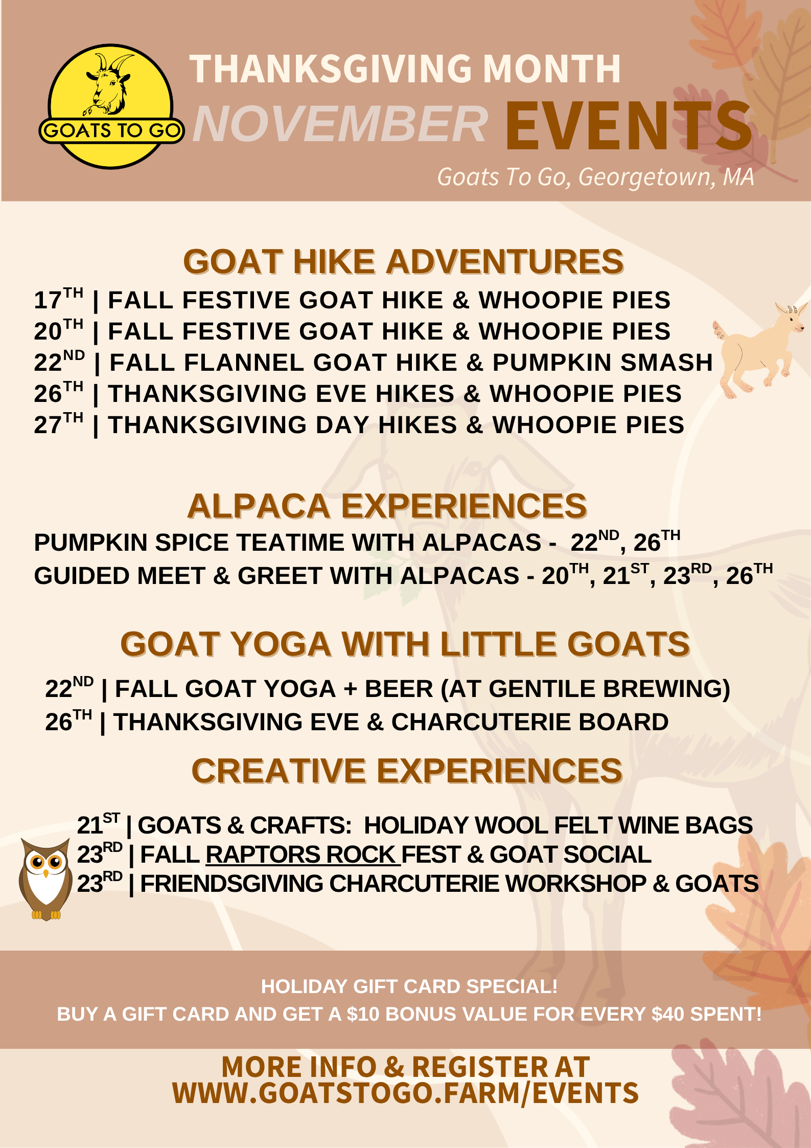 EVENTS BOOK NOW FEATURED EVENTS November Schedule December Schedule Goat Hike Season Now Thru May Goats & Crafts – 11/21 Goat Yoga + Beer – 11/22 Raptors Rock & Goats – 11/23 Friendsgiving Goat Social + Charcuterie Workshop – 11/23 Goat Yoga & Board – 11/26 Craft & Sip – 12/18 Paint Night – 12/20 What We Offer Goat Hikes Baby Goat Mingle & Snuggle Goat Yoga Alpaca Experiences Creative Experiences Request A Private Event Farm Camps Gift Cards Yoga To Farms & Community Classes Calendar View