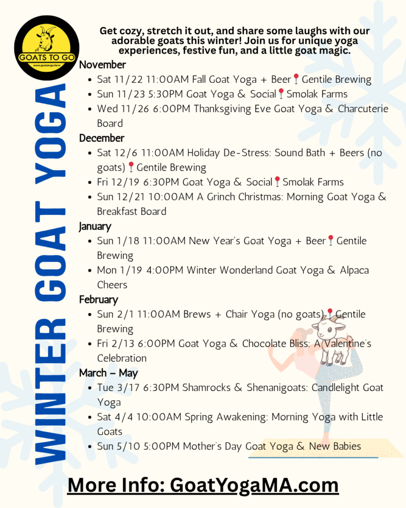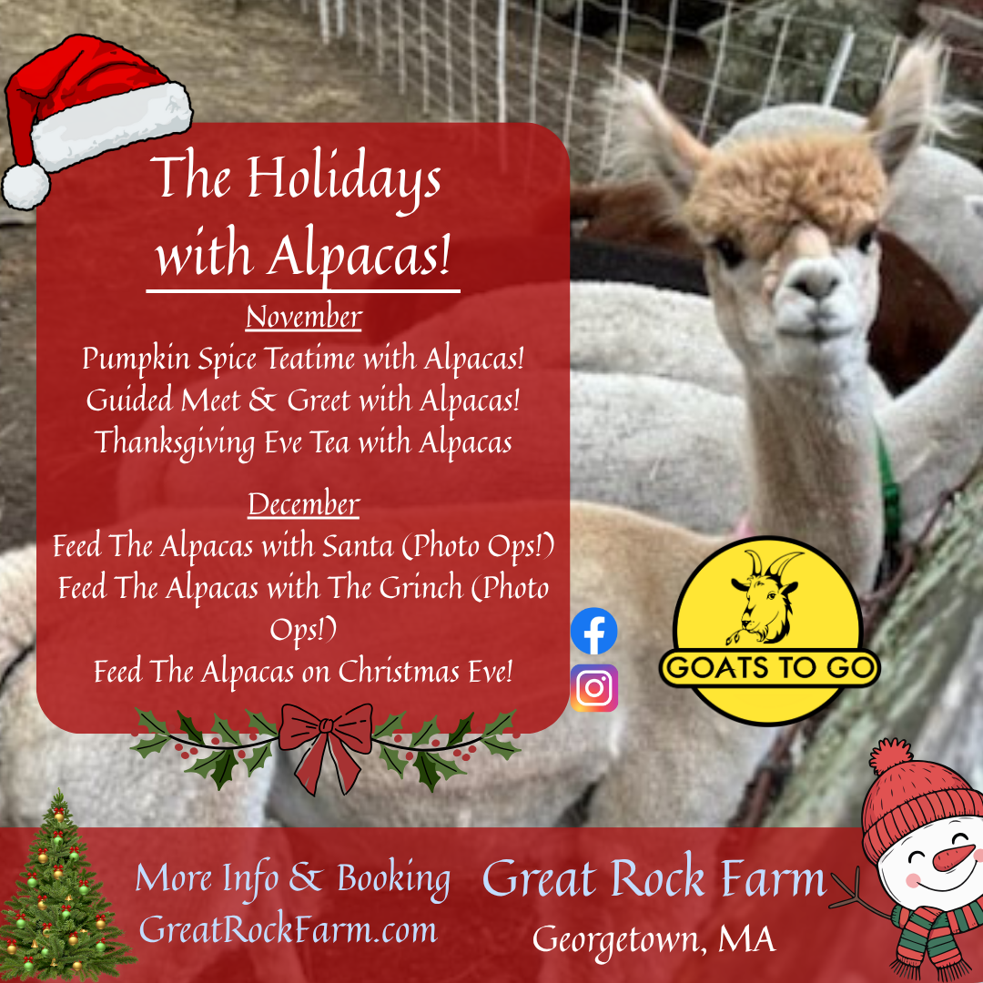 EVENTS BOOK NOW FEATURED EVENTS November Schedule December Schedule Goat Yoga Winter Schedule Goat Hike Season Now Thru May Holidays With Alpacas! Goats & Crafts – 11/21 Goat Yoga + Beer – 11/22 Raptors Rock & Goats – 11/23 Friendsgiving Goat Social + Charcuterie Workshop – 11/23 Goat Yoga & Board – 11/26 Craft & Sip – 12/18 Paint Night – 12/20 What We Offer Goat Hikes Baby Goat Mingle & Snuggle Goat Yoga Alpaca Experiences Creative Experiences Request A Private Event Farm Camps Gift Cards Yoga To Farms & Community Classes Calendar View