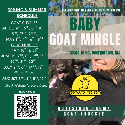 We host year-round farm experiences designed to bring you up close and personal with our baby fainting goats! In April and May, join our cozy Cuddle Sessions—20 minutes of seated mat time to snuggle and interact with our youngest goat kids, who are still with their nannies. From June through October, enjoy our lively Goat Mingle Classes—40 minutes of hands-on fun, feeding, brushing, and learning about our playful goat “kids,” rain or shine.