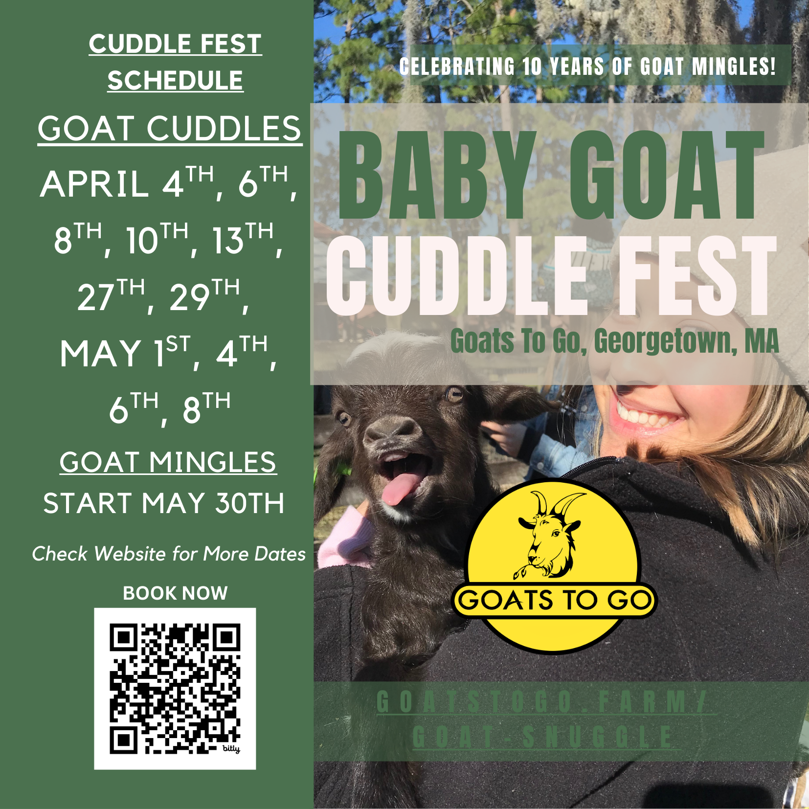 We host year-round farm experiences designed to bring you up close and personal with our baby fainting goats! In April and May, join our cozy Cuddle Sessions—20 minutes of seated mat time to snuggle and interact with our youngest goat kids, who are still with their nannies. From June through October, enjoy our lively Goat Mingle Classes—40 minutes of hands-on fun, feeding, brushing, and learning about our playful goat “kids,” rain or shine.