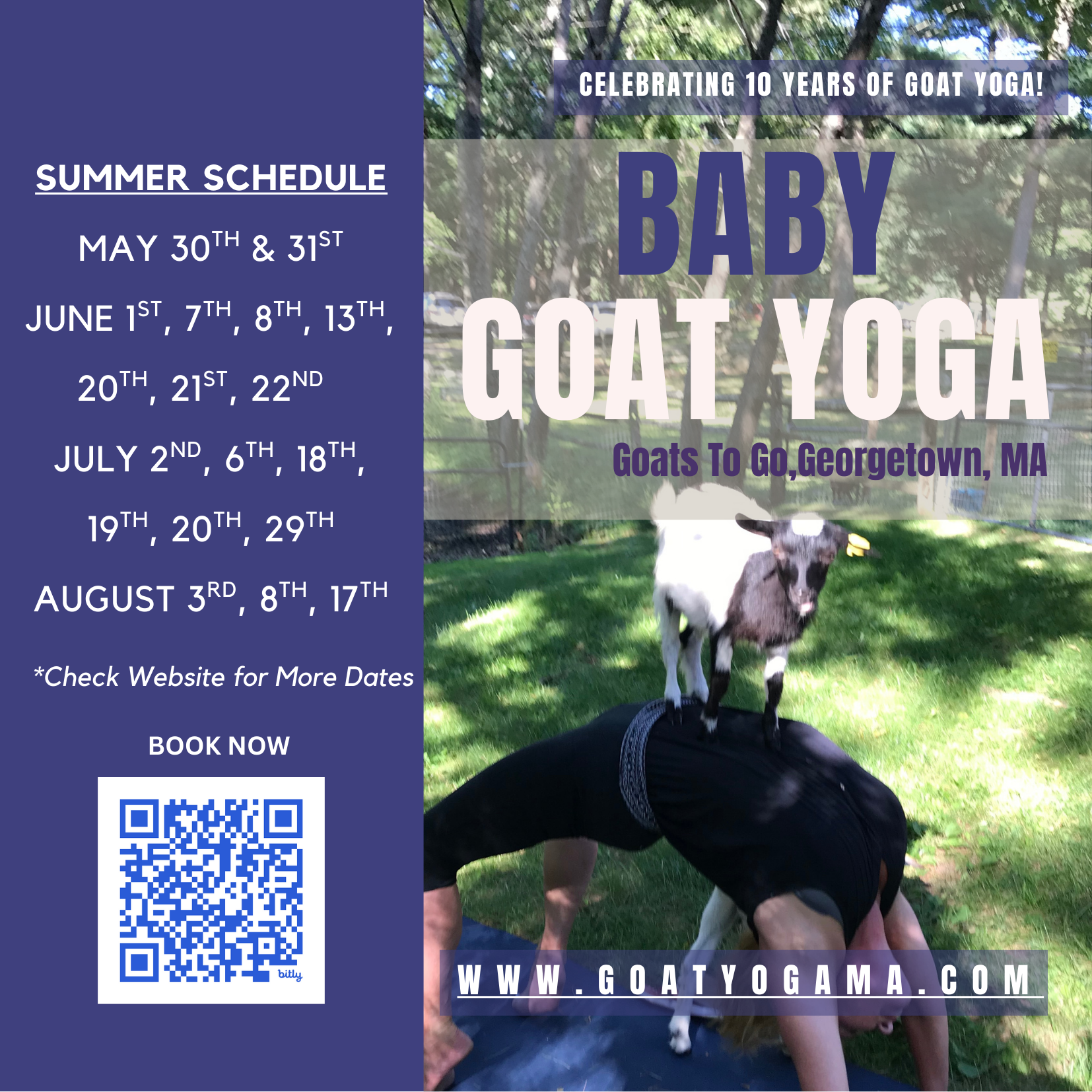 As we look ahead to celebrating our 10th season in 2026—alongside the national excitement of the American 250 celebrations—there’s truly no better time to come experience the charm, joy, and connection that make goat yoga with us so special. Join us for a class, breathe a little deeper, laugh a little louder, and discover why our guests return again and again.